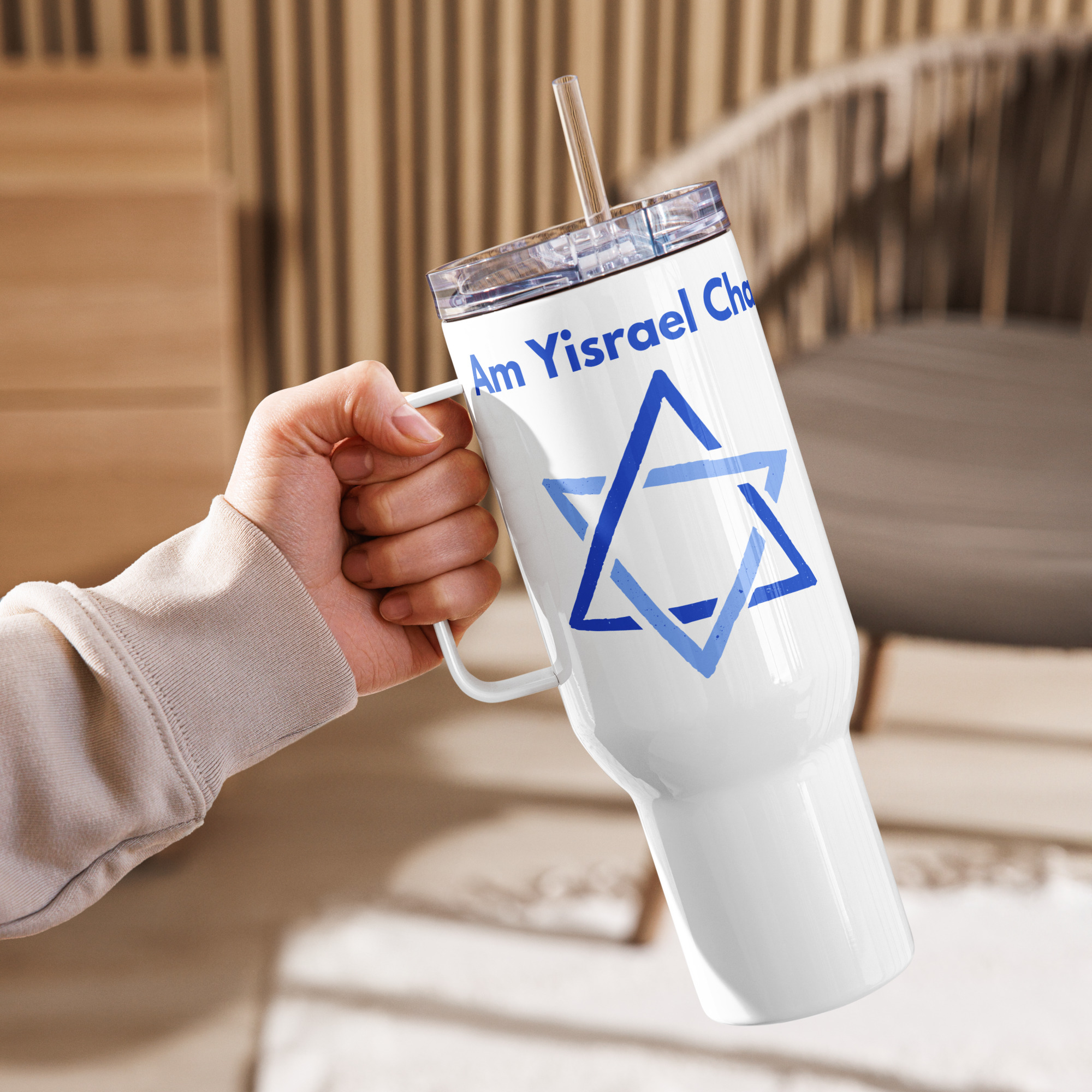 Embrace your faith and stay hydrated with the inspiring Am Yisrael Chai English Star Travel Mug with Handle. This elegantly designed mug features the powerful message “Am Yisrael Chai” (“The People of Israel Live”) in English, beautifully accompanied by a prominent Star of David.