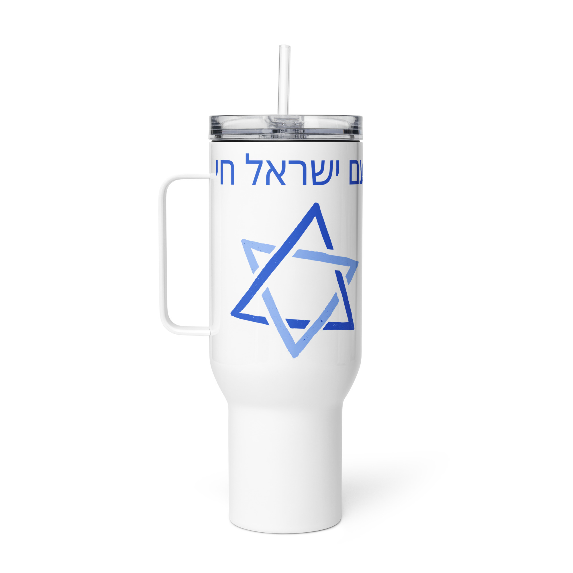 Experience the ultimate on-the-go luxury with our elevated travel mug that fits most car cup holders, has a spill-proof lid, and keeps your drinks at the perfect temperature for your commute or adventures. This “Am Yisrael Chai” Hebrew Star travel mug with handle is more than just a container for your favorite beverage; it’s a powerful statement of faith and a symbol of Jewish pride. Featuring the iconic “Am Yisrael Chai” (Hebrew: עם ישראל חי, meaning “The People of Israel Live”) inscription and a beautifully rendered Star of David, this high-quality travel mug is perfect for everyday use.