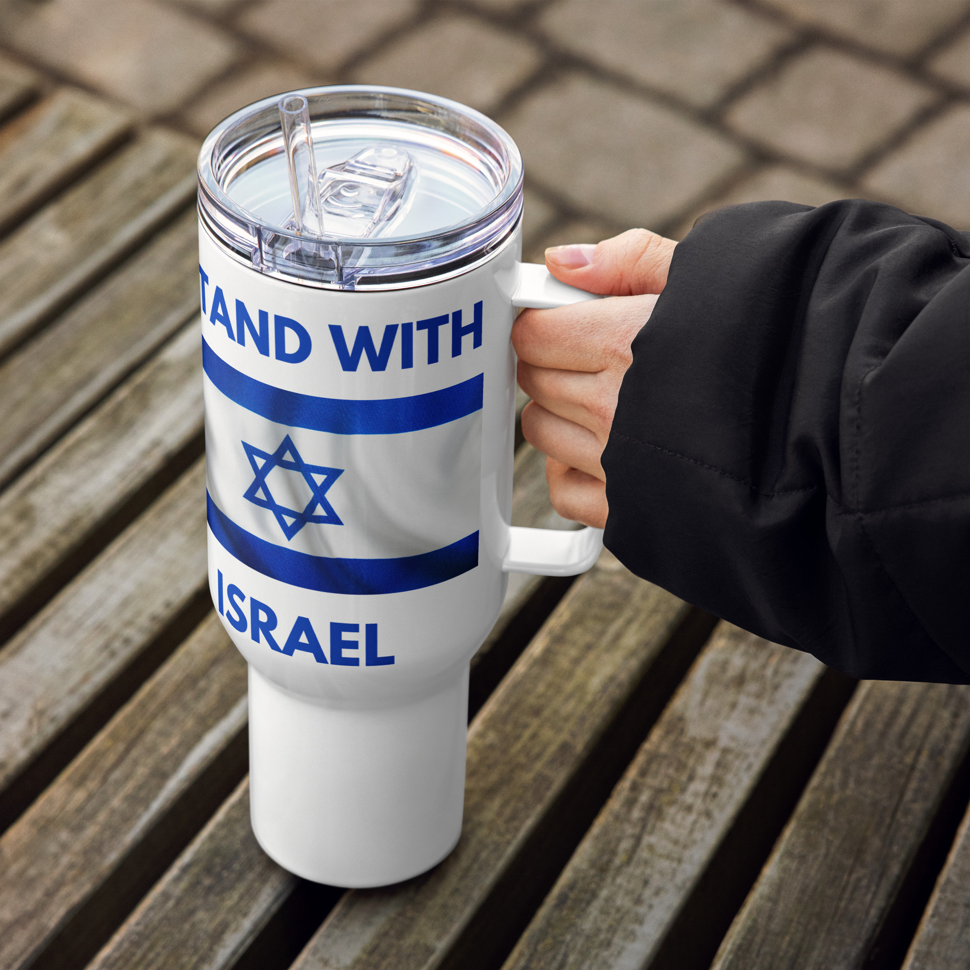 Unleash your support for Israel with this inspiring ‘I Stand With Israel’ Flag Travel Mug. Featuring the iconic Israeli flag and a powerful message of solidarity, this sleek and durable insulated stainless steel mug is the perfect companion for your daily adventures. Designed for both style and function, it keeps your beverages hot or cold for hours while the comfortable handle ensures easy carrying. Order yours today and #StandWithIsrael in style.