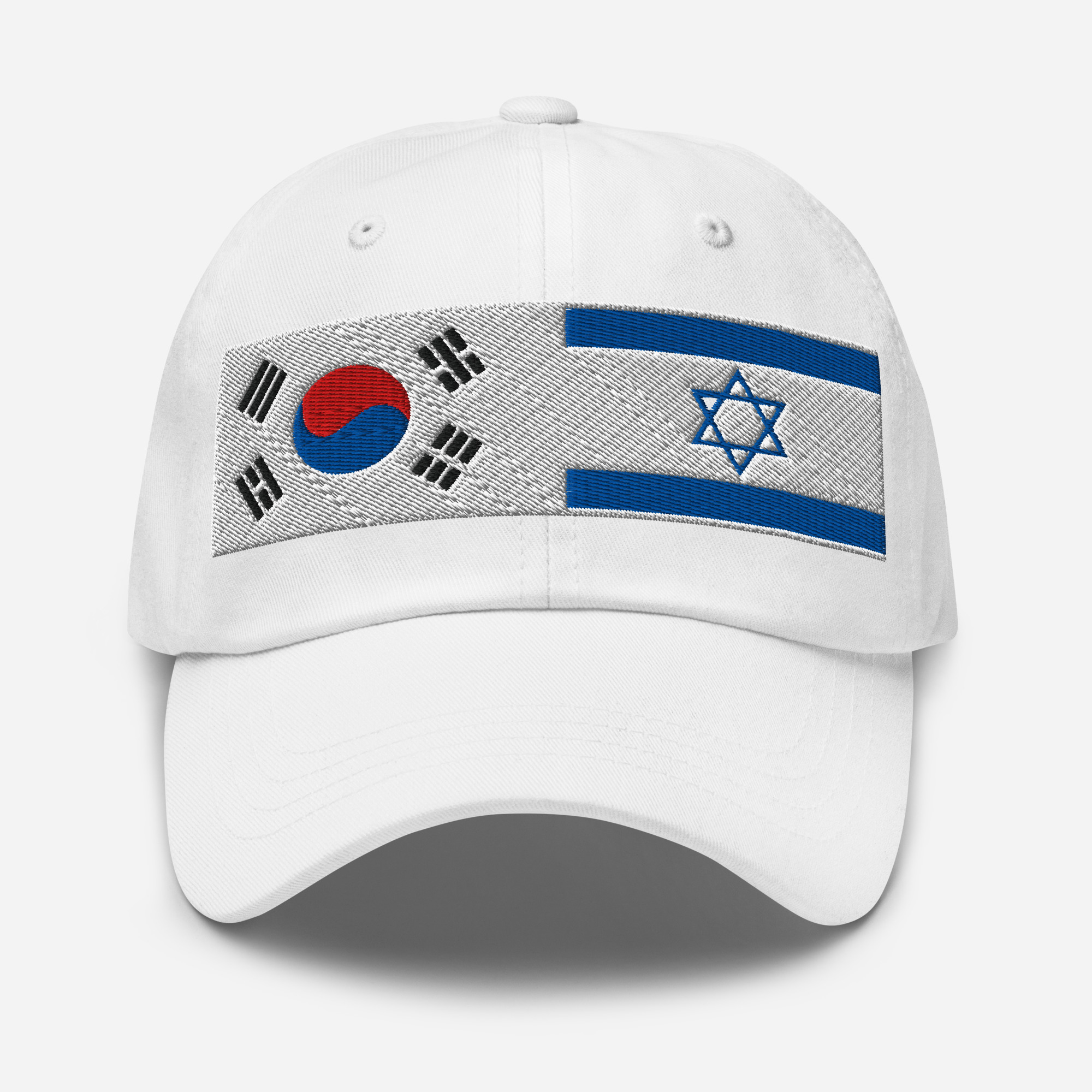 This stylish Israel & South Korea Flags White Cap is a meaningful addition to your everyday look. Express your pride and connection with this unique design featuring the combined flags of Israel and Brazil, embroidered side by side for a bold yet clean statement. Crafted from high-quality materials, this comfortable hat is perfect for daily wear, travel, or showing your support on any occasion.