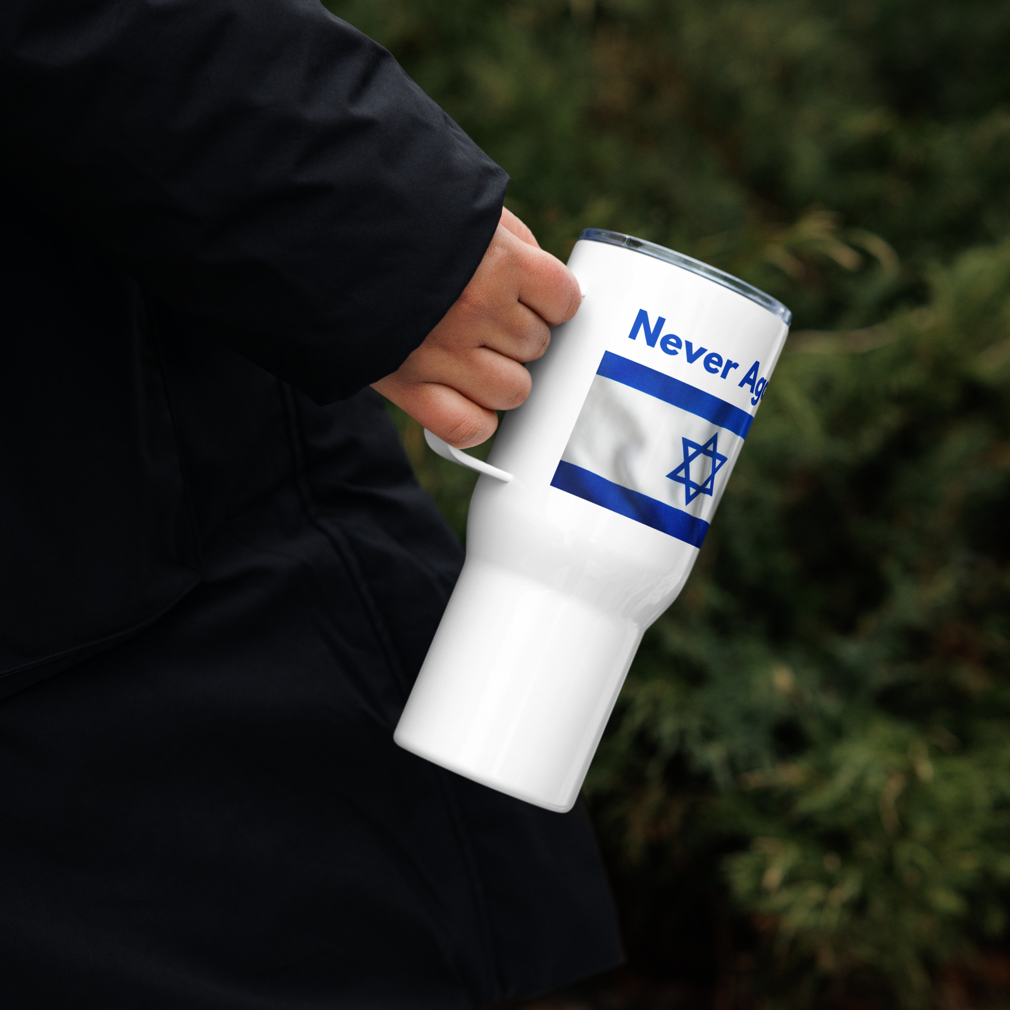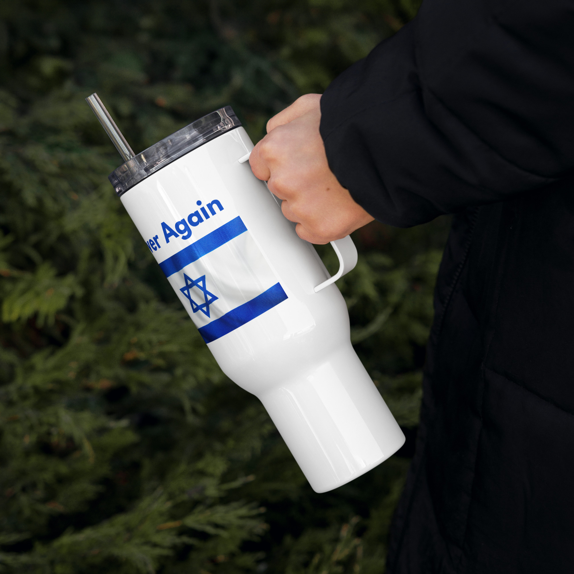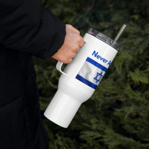 More than just a mug, this ‘Never Forget’ travel mug with handle serves as a daily reminder of peace and the importance of remembering the past. Featuring the vibrant Israel flag, it inspires reflection on human rights and the enduring spirit of humanity while you enjoy your favorite beverages.