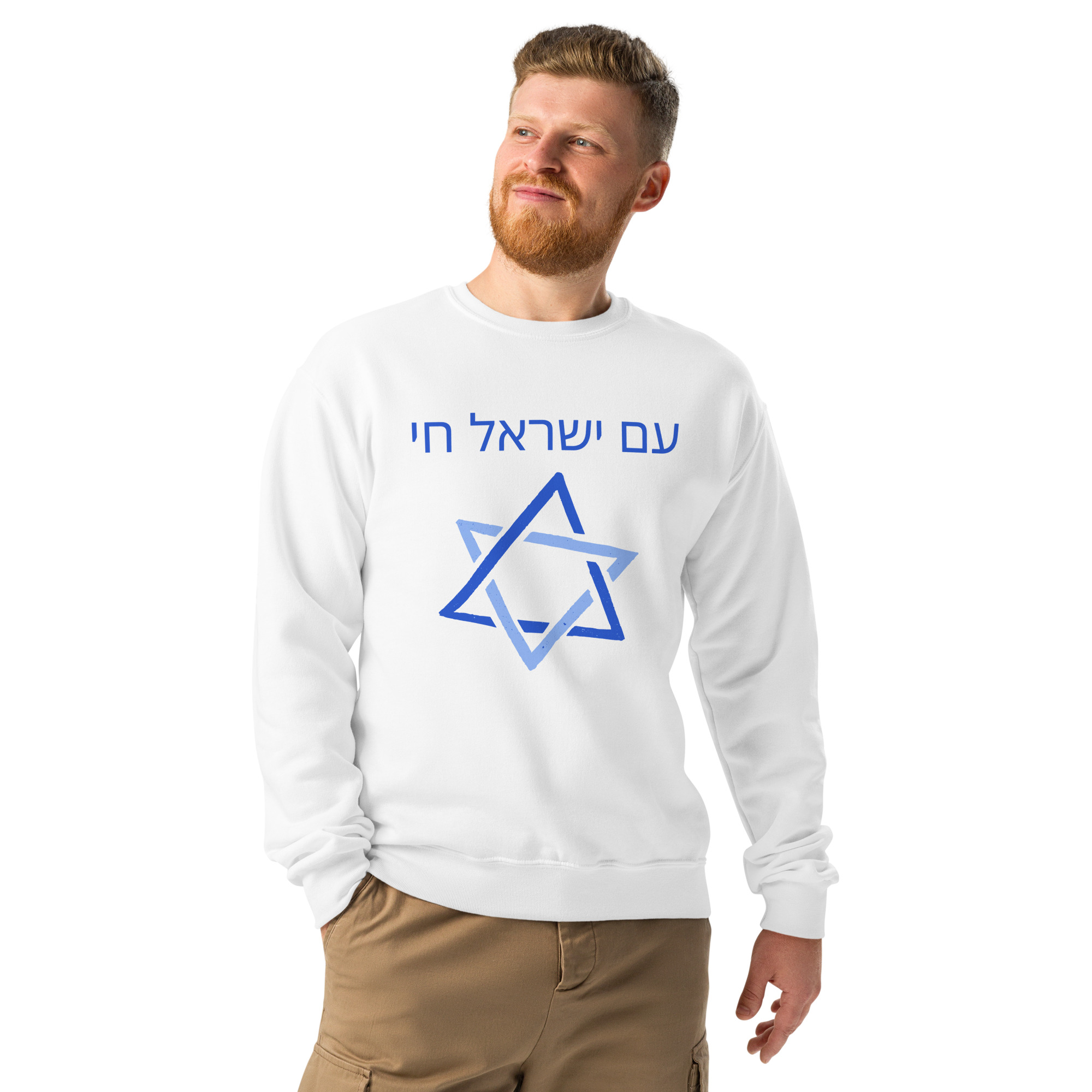 This Am Yisrael Chai Hebrew Star Crew Neck Sweatshirt is more than just clothing. It’s a powerful statement of faith and identity. Featuring the inspiring Hebrew phrase “Am Yisrael Chai” (“The People of Israel Live”) alongside a prominent Star of David, this sweatshirt allows you to express your Jewish pride with style and comfort.