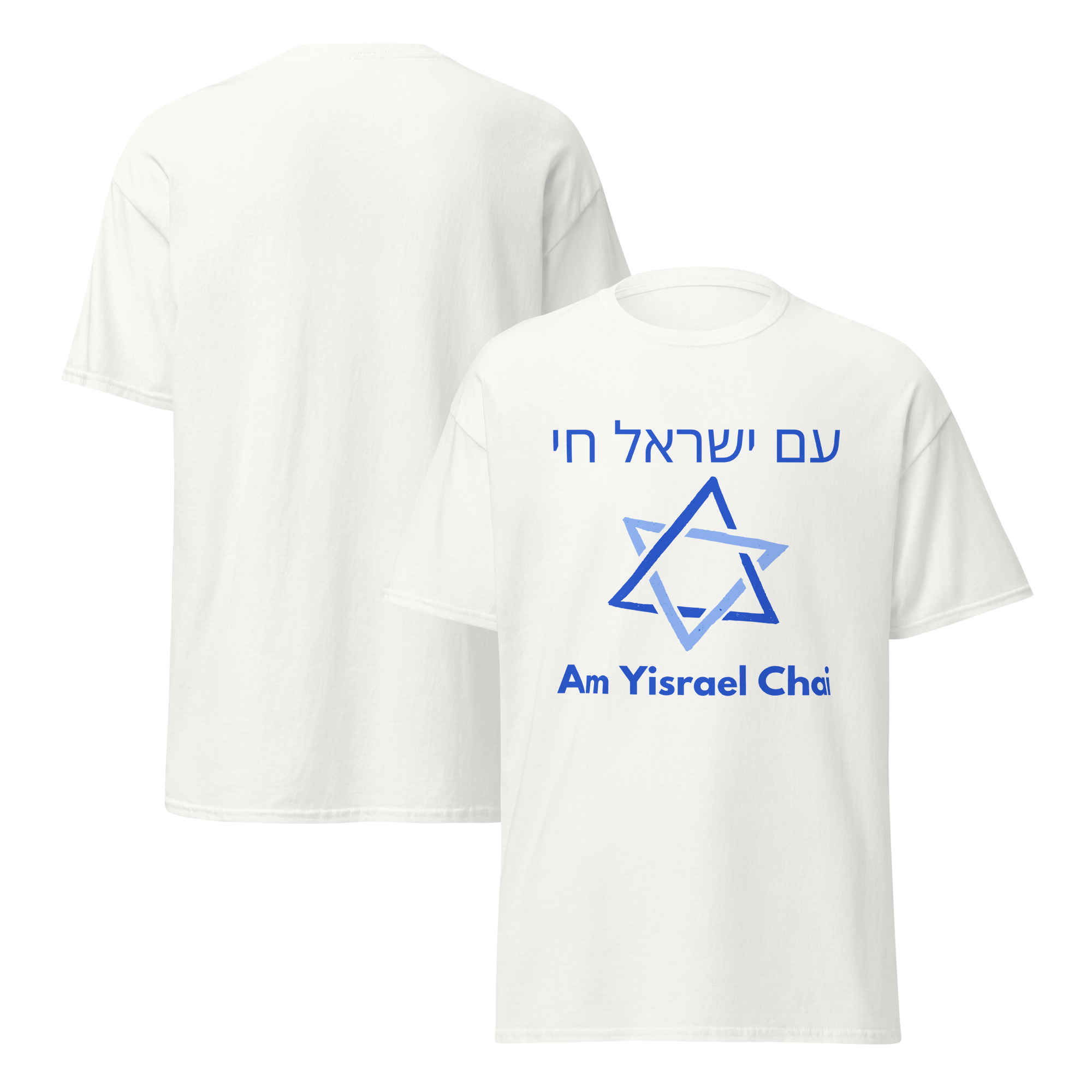 This isn’t just a t-shirt; it’s a powerful statement of faith and identity. Our Unisex Classic Am Yisrael Chai Hebrew & English Star T-Shirt proudly displays the inspiring Hebrew phrase “Am Yisrael Chai” (“The People of Israel Live”) alongside its English translation and a prominent Star of David.