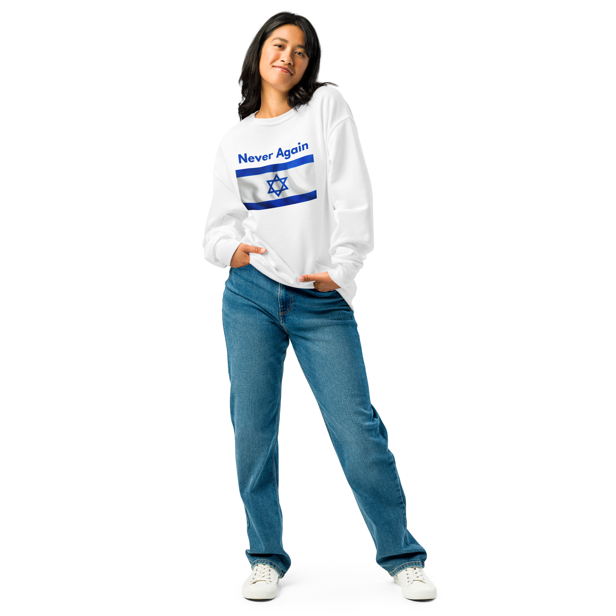 This Unisex “Never Again” Israel Flag Crew Neck Sweatshirt is a meaningful way to stand against hatred and prejudice. Featuring the the vibrant Israeli flag, this high-quality sweatshirt features a comfortable, relaxed fit and breathable fabric for maximum comfort.